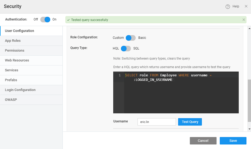 - In the case of Custom Role Configuration, Query Type can be set to HQL or SQL. By default, HQL is selected and a default query is generated, which can be modified.