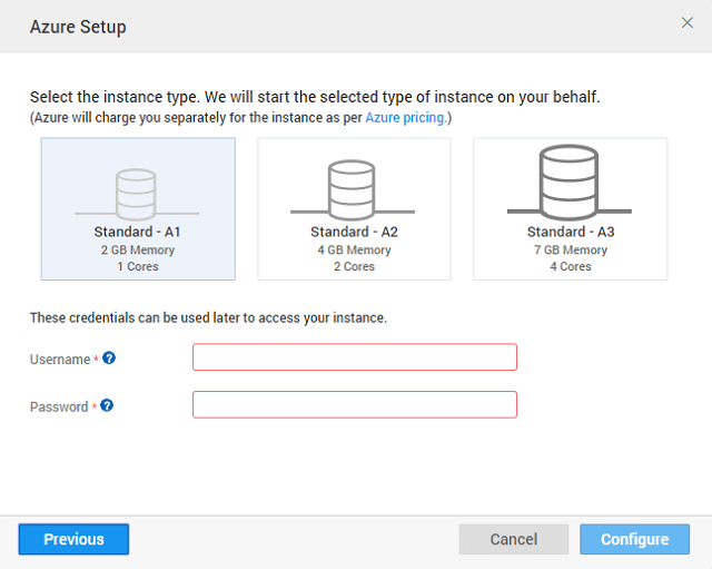 • Select the appropriate instance based on your app requirements. You can choose from the three options provided (see here for size comparisons) and enter the Username and Password details. See here for more information regarding setting up of Azure VM like username, password, etc..
