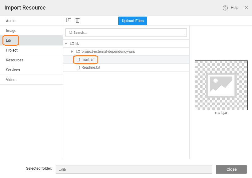 - Import Resource, and select the Lib folder to place the jar file to be imported. As an example, we are using a mail file.