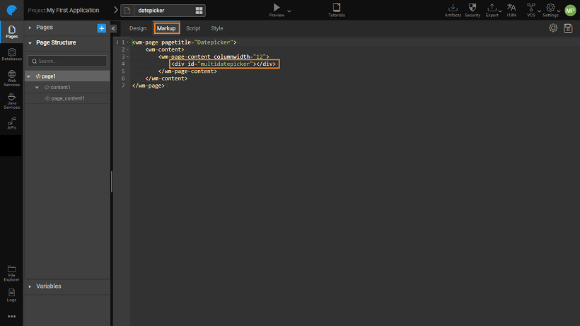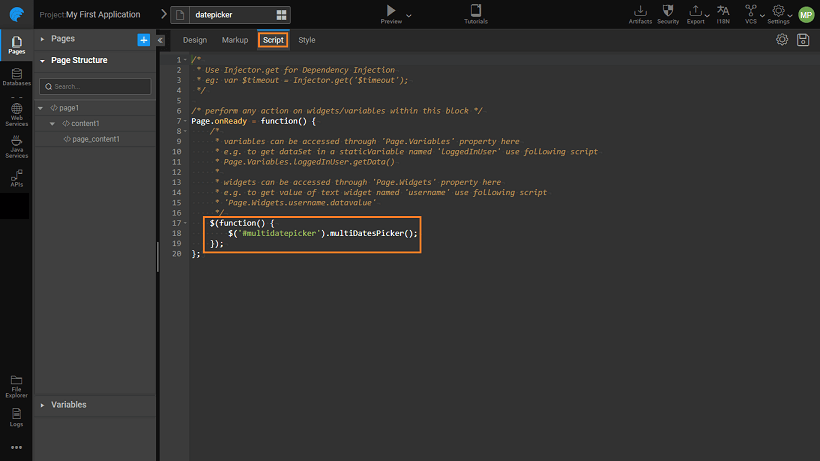 In the script tab attach the mulitdatespicker function from the js file imported to the div created
