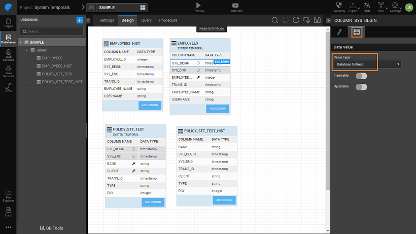 • By default system period columns and transaction id are marked as Database defined. The values need not be entered by the user, they will be auto-populated by the database.
