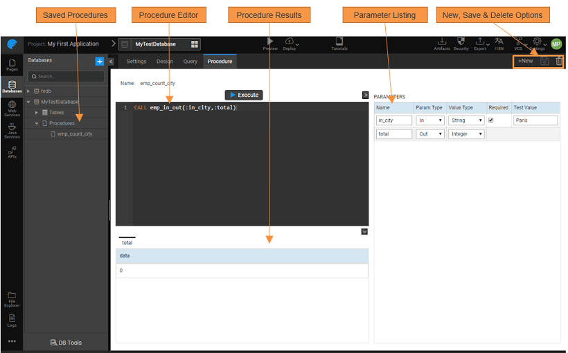 Procedure tab from WaveMaker Database Designer can be used to execute procedures that are written in and imported from the database using the call command. Execute the procedure calls and save them for the usage within the app by creating Variable using the generated APIs.