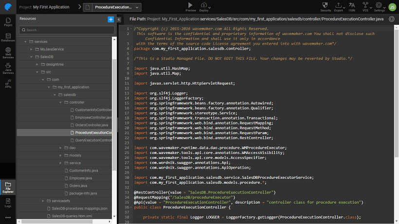 WaveMaker supports the execution of procedures/functions written using PL/SQL. You can find out more about Stored Procedures here. In this section, we will be seeing how WaveMaker supports Stored Procedures with the help of an example. We are using a MySQL database.
