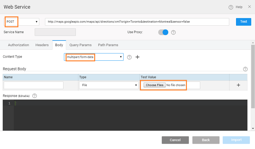 When importing REST Service which requires string or file as input, set the Content Type from Body tab to multipart/form-data to see the options for the Request Body parameters. The type of these parameters can be set to: