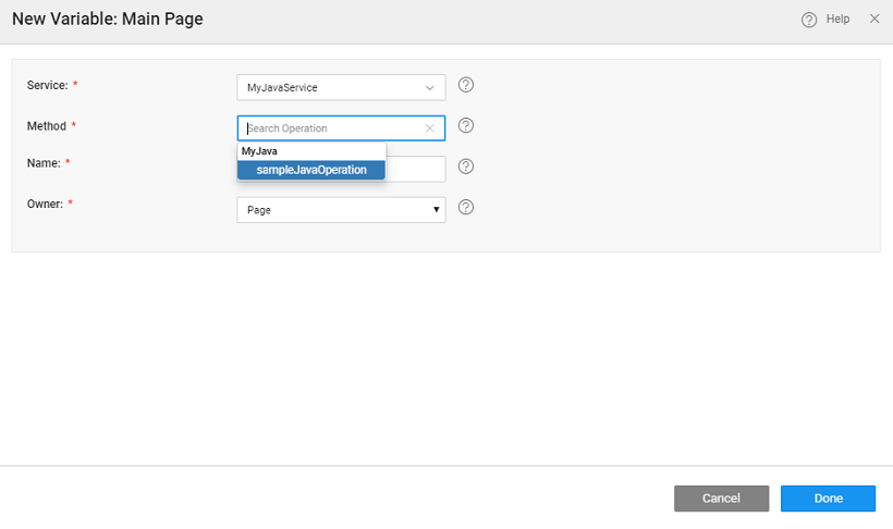 For each method within the Java Service, a service variable can be generated using the appropriate option from the Operation property; with the input parameters available within the Data tab and the output available as the datavalue for binding. You can invoke the Java Service by triggering a call to the Service Variable generated. In case you have multiple public class methods in your Java Service, you will see multiple Operation options.