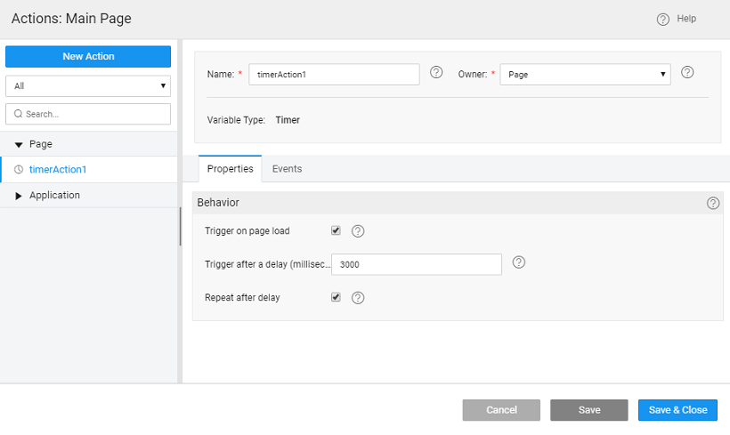 A Variable that gives Facebook-like feeds after a certain timestamp. Assign Javascript to the onTimerFire event and write following logic. Once the Timer Action is triggered, if repeating property is set, then the variable will be invoked after every delay milliseconds.