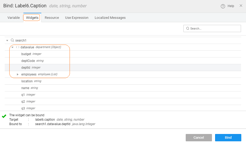 3. Bind the Value dataset property of the search widget to the department variable created in the previuos step.