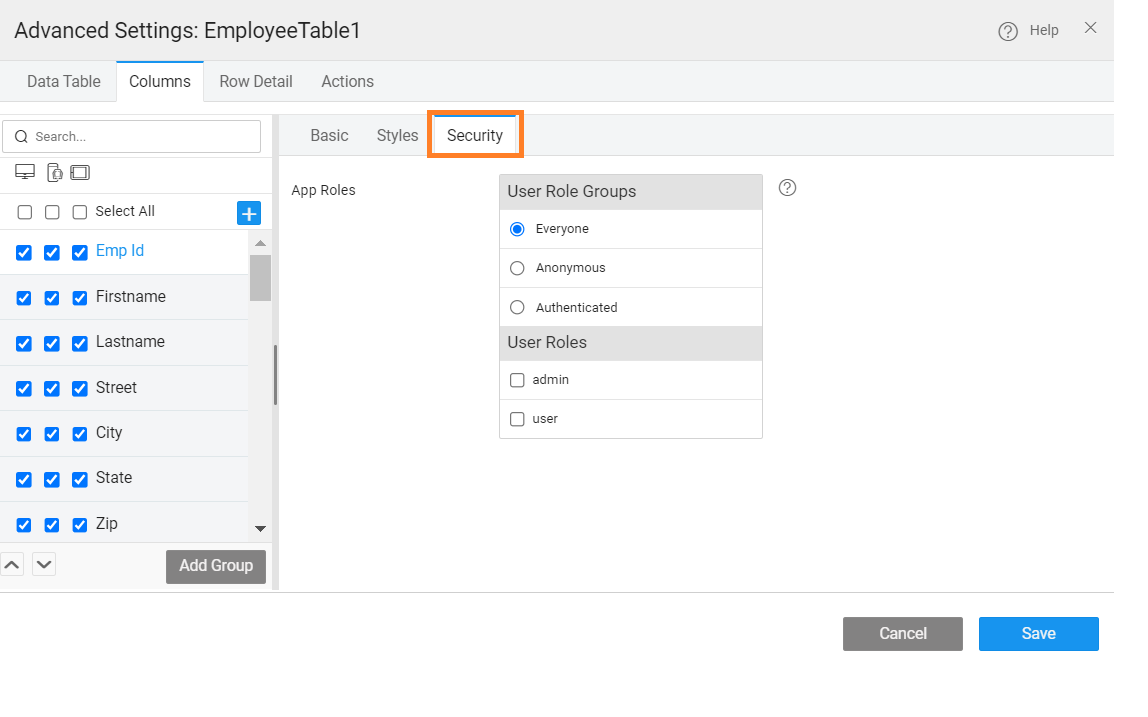 Role-based access can be set to enforce security at column-level: If the security has been enabled in your app, then you can define the app role which has access to a specific column.