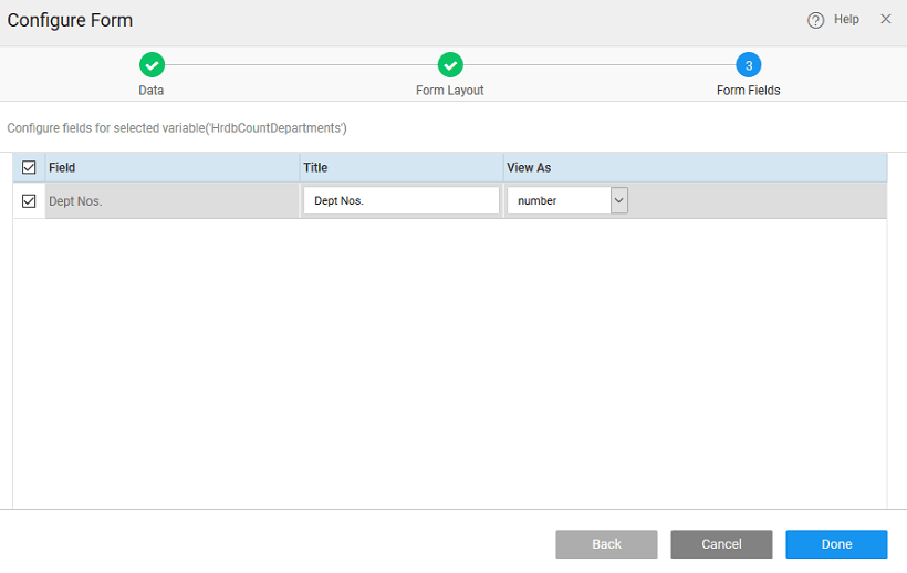 3. Select the fields to be available for the user to interact with. All the fields from the selected data source will be presented for selection and assign the display widget for each.