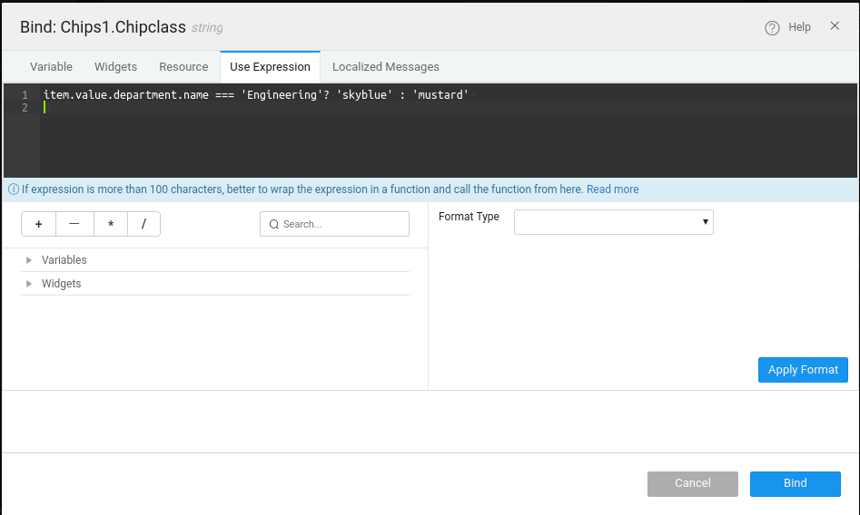 - From the Styles tab bind the Chip item class name to the following expression: