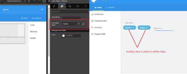 - Setting the chip item class name (or Class Name property) as skyblue, will apply skyblue class to all the chips at runtime.