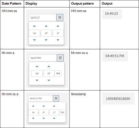 | Output Format | Defines the format of output data value returned by the time widget. Default output format is 'timestamp', which returns the equivalent timestamp integer. E.g timestamp value for '10:10:00 AM' is '16800000'. If the output format is given as 'hh:mm a', widget returns data value as '10:10 AM'. |