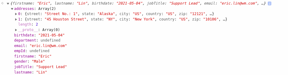 The final object structure will be as shown in the image below along with the employee details, i.e., two address object details, including, one residential and permanent addresses.