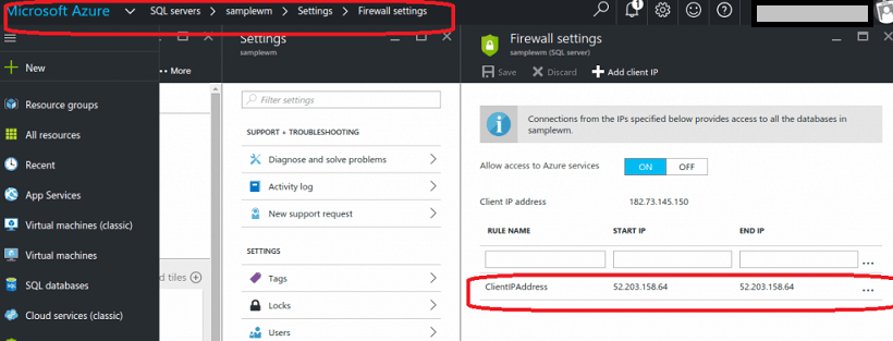 - To set up firewall in Azure SQL navigate to Sql Servers-> <your-database-server> -> settings -> firewall settings