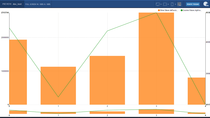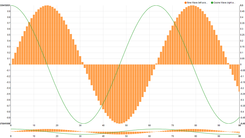 Enter the following code (you can copy and paste the same). This code generates the sin and cosine values that can be represented on the chart. Note that for the sin values, the bar attribute is set to true, thus the sine values are represented as bar chart while cosine values are represented as line graph. Click here for the code.