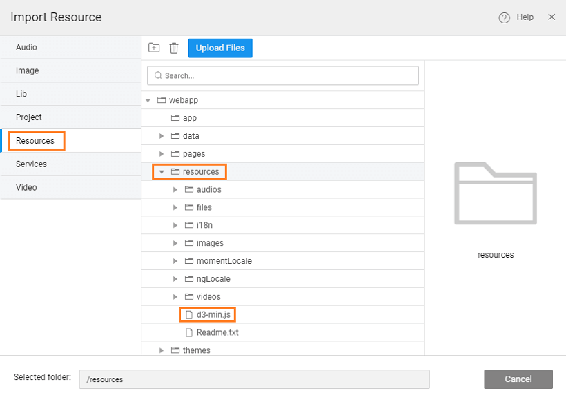 - From Resources, add the js files