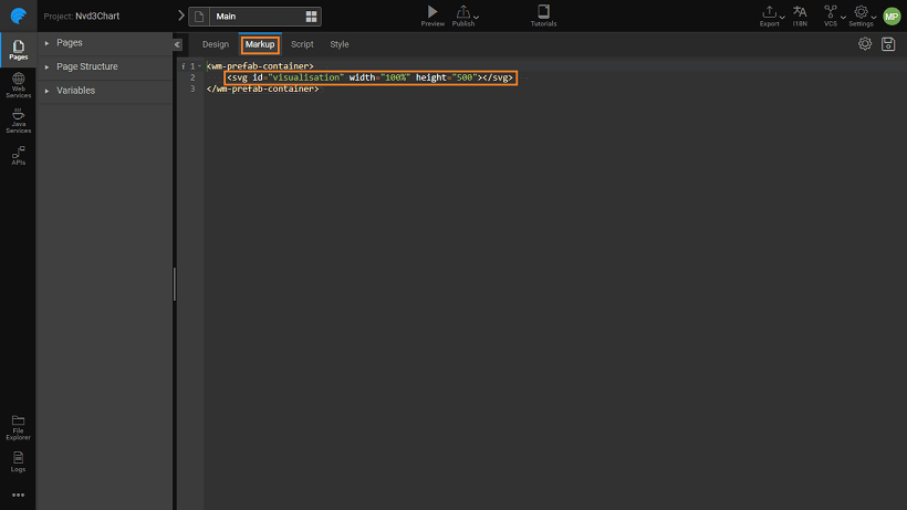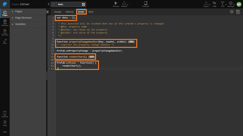 Prefab.onPropertyChange = propertyChangeHandler;- Enter the following code (you can copy and paste the same). This code is to set up the visual rendering of D3 chart.