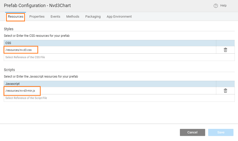 - From Resources, include the script and css files imported earlier, you can pick from the drop down list