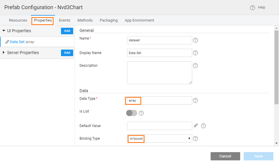 - Add Property - dataset with attributes Widget set to text, Type set to object (type it, if not selectable) and Bindable set to in-bound