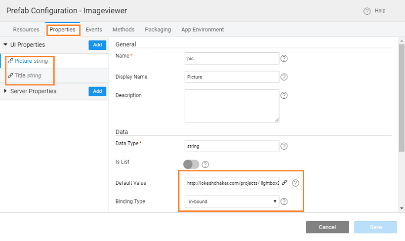 - Properties: any properties you want to expose to the user of this prefab. Here we have set two properties pic and title, both being in-bound.