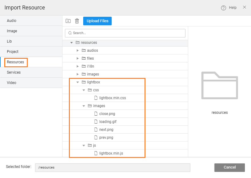- Upload the following files to their respective folders - lightbox.min.js, lightbox.min.css and four images. You will find these files in the respective folders from the extracted folder lighbox2-master/dist folder.