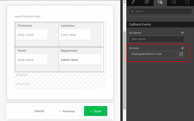 6. Select the wizard widget and onDone event select save method of the liveform from the dropdown(to save the form on Done button click present on the last step of the widget widget). Check below image for reference.