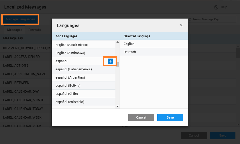 - Use + sign next to Message Key header to open the Localized Message Dialog.