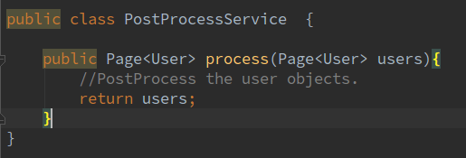 - Create a service in user src/main/java folder of the project Example: UserManagementApp/src/main/java/com/hrdb/service/PreProcessUserService.java
