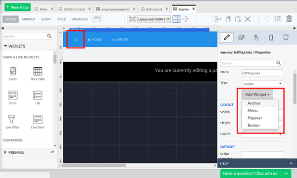 Open the topnav partial page and add an anchor widget. Specify the icon Class as “wi wi-list-ol” for the newly added anchor.