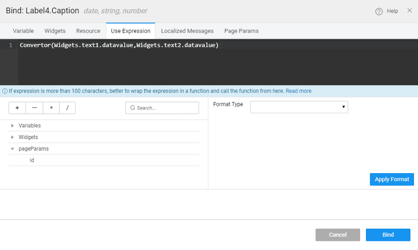 - Instead of the button click event, you can invoke the JS function from the Use Expression option of the bind dialog for the Label caption property: