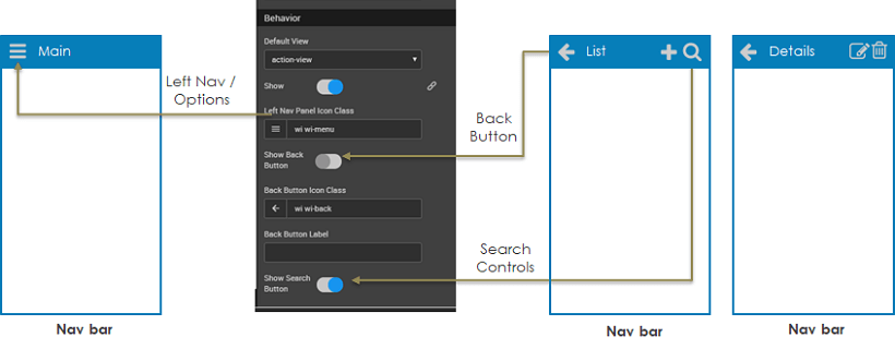 As mentioned in the previous section, default top navbar can be selected as part of the Page Layout. This Navbar can be configured to enable pre-defined controls for left navigation, back button or search. In addition, custom actions like add, edit, delete etc. can also be incorporated. Navbar can have Menu, Popover widgets.