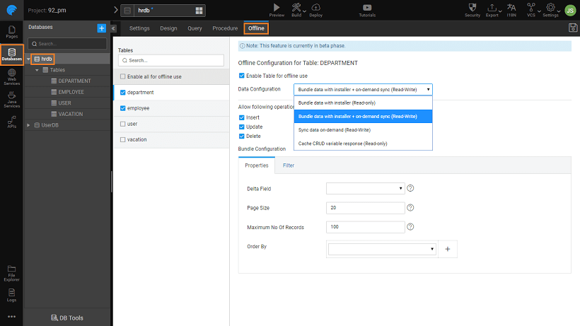 By default, three variables networkInfo, datasyncPush and datasyncPull are created when for any table offline is enabled. They are configured in such a way that whenever the user comes online, offline data changes (if any) are pushed automatically. Using these variables, custom workflows for data push can also be created. You can control the pull behavior through the datasyncPull variable's property: