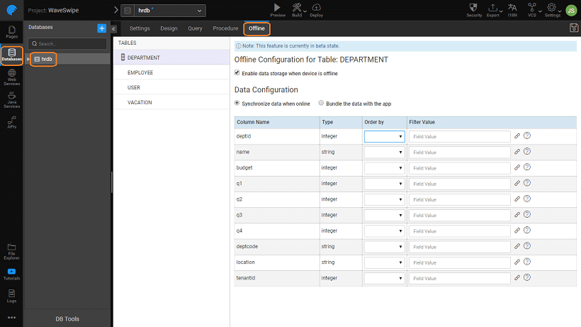 14. If a table has to be available in offline, select the table and then check the flag ‘Enable data storage when device is offline'.