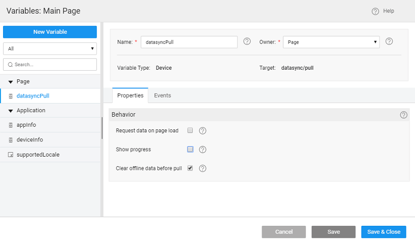 4. Two variables, datasyncPush and networkInfo, are automatically created. With these variables in place, the app will push offline data changes whenever the mobile comes online.