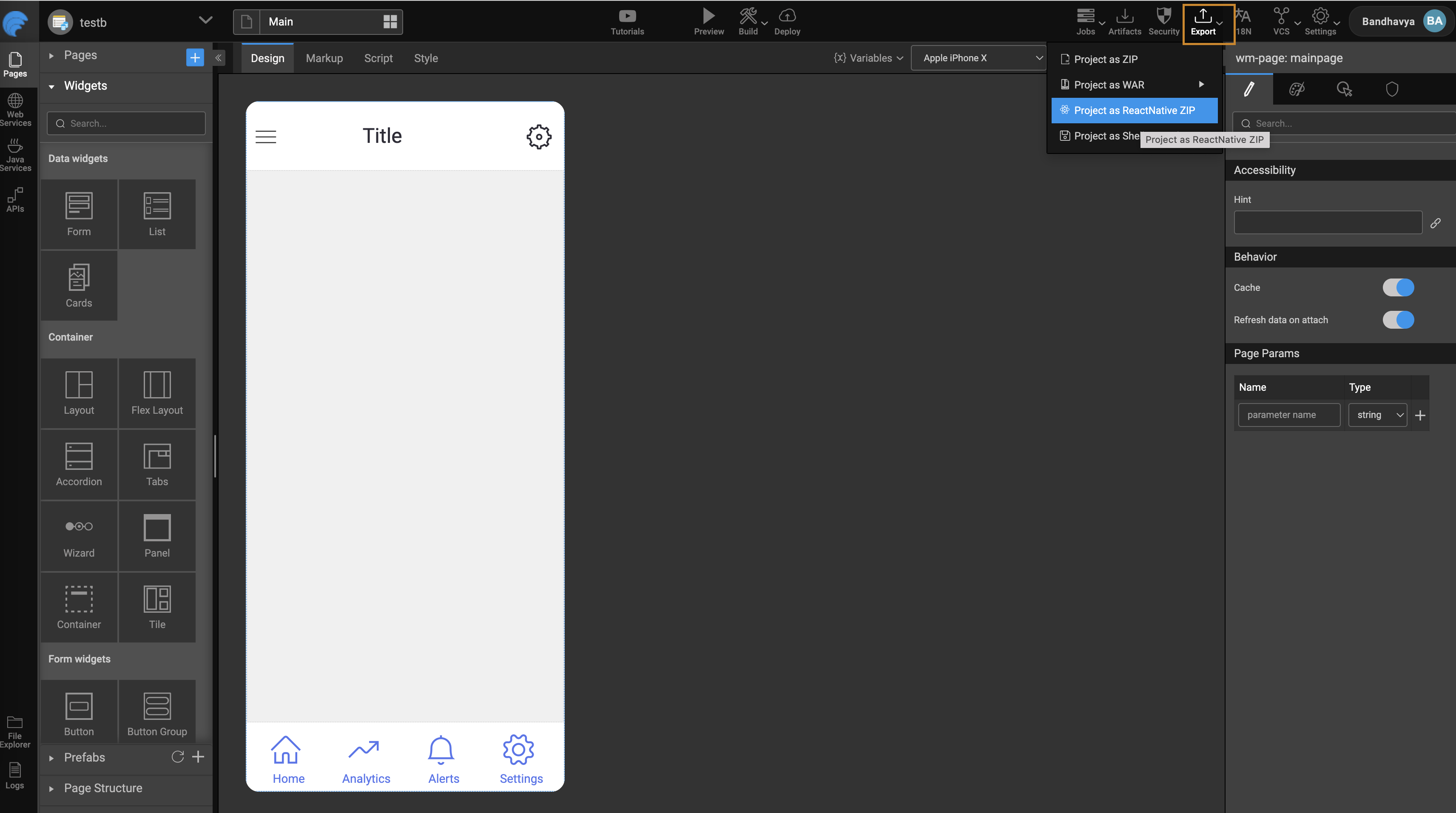 A ReactNative zip is used to create a platform-specific installer. WaveMaker supports generating React Native installers for Android and iOS devices. Below are two ways that a React native zip can be generated from WaveMaker project.