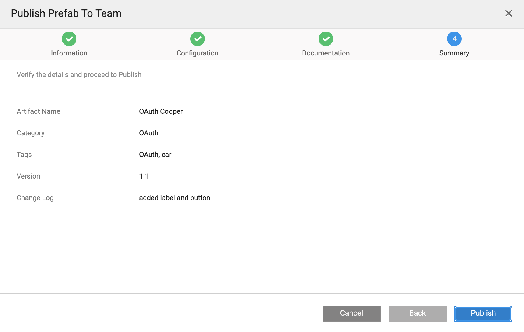 Verify the details in the configuration summary of the Prefab and click Publish. The published Prefab will be queued for approval by administrator.