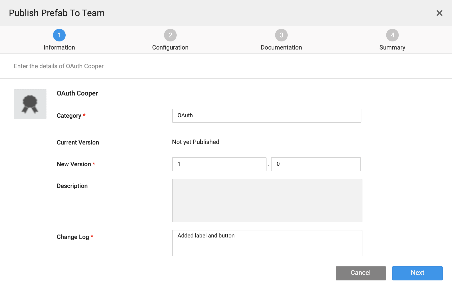 - New Version: Provide incrementing version number by checking the Current Version details. You can include major and minor Prefab version releases.